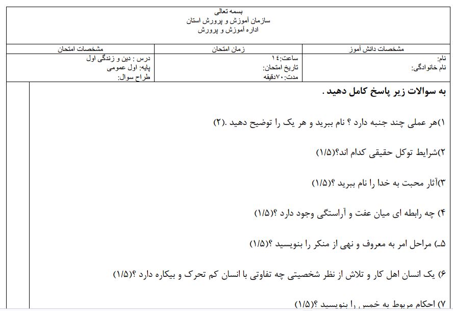 نمونه سوال دین و زندگی پایه دهم با جواب به صورت pdf و word
