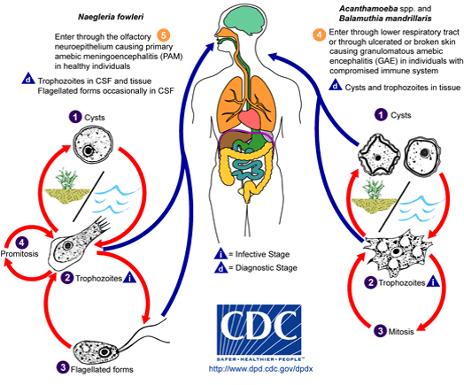  گونه های متعددی از آمیب های تاژکدار با زندگی آزاد و یا آمیب های دیگر از مایع نخاع و مغز بیمارانی که به علت مننگوآنسفالیت فوت کرده اند، جدا و کشت داده شده است و اغلب این موارد ناشی از گونه های نگلریا ، نگلریافاولری، که دارای هر دو مرحله ی تاژکدار و آمیبی شکل است و برخی نیز به علت گونه ای از آمیب ها موسوم به آکانتامبا بوده است.